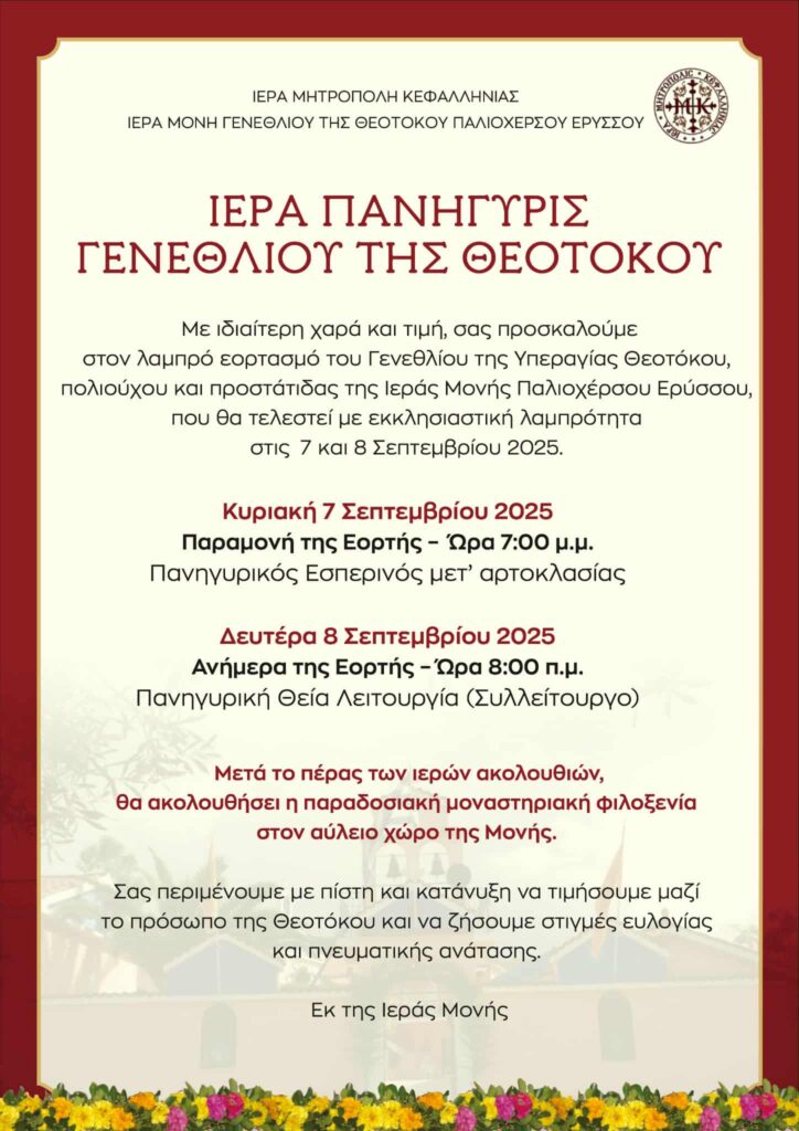 Κάθε χρόνο στις 8 Σεπτεμβρίου, οι καμπάνες χτυπούν χαρμόσυνα στην Ιερά Μονή Παλιοχέρσου, στην ‘Ερυσσοο της Κεφαλονιάς, για να τιμήσουν τη Γέννηση της Παναγίας μας. Η μέρα αυτή είναι γεμάτη φως και ελπίδα, καθώς γιορτάζουμε την αρχή της σωτηρίας του κόσμου, με τη γέννηση της Μητέρας του Χριστού.