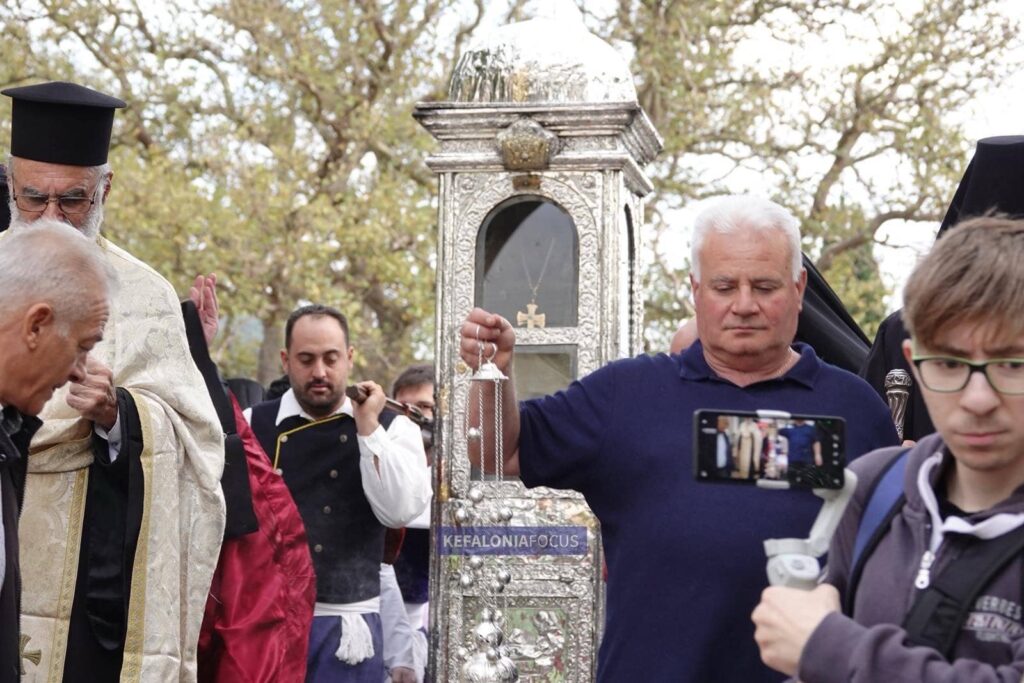 Πολλοί προσκυνητές, μεταξύ των οποίων και ευσεβείς χριστιανοί από τη Ρουμανία, ξάπλωσαν στην πλακόστρωση του εξωτερικού χώρου της Μονής, για να περάσει από πάνω τους το Σκήνωμα του Αγίου, σύμφωνα με το έθιμο που συμβολίζει την ευλογία και τη θεία χάρη του θαυματουργού προστάτη της Κεφαλονιάς.