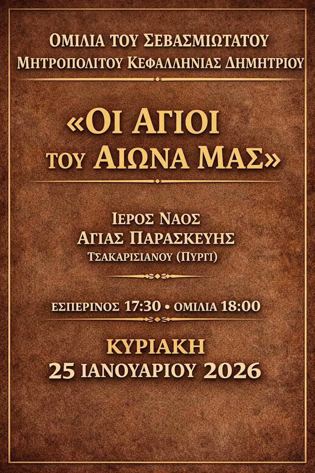 Την Κυριακή 25 Ιανουαρίου 2026 στον Ιερό Ναό Αγίας Παρασκευής, Τσακαρισιάνου (Πυργί) θα πραγματοποιηθεί η ομιλία του Σεβασμιωτάτου Μητροπολίτου Κεφαλληνίας Δημητρίου με θέμα: