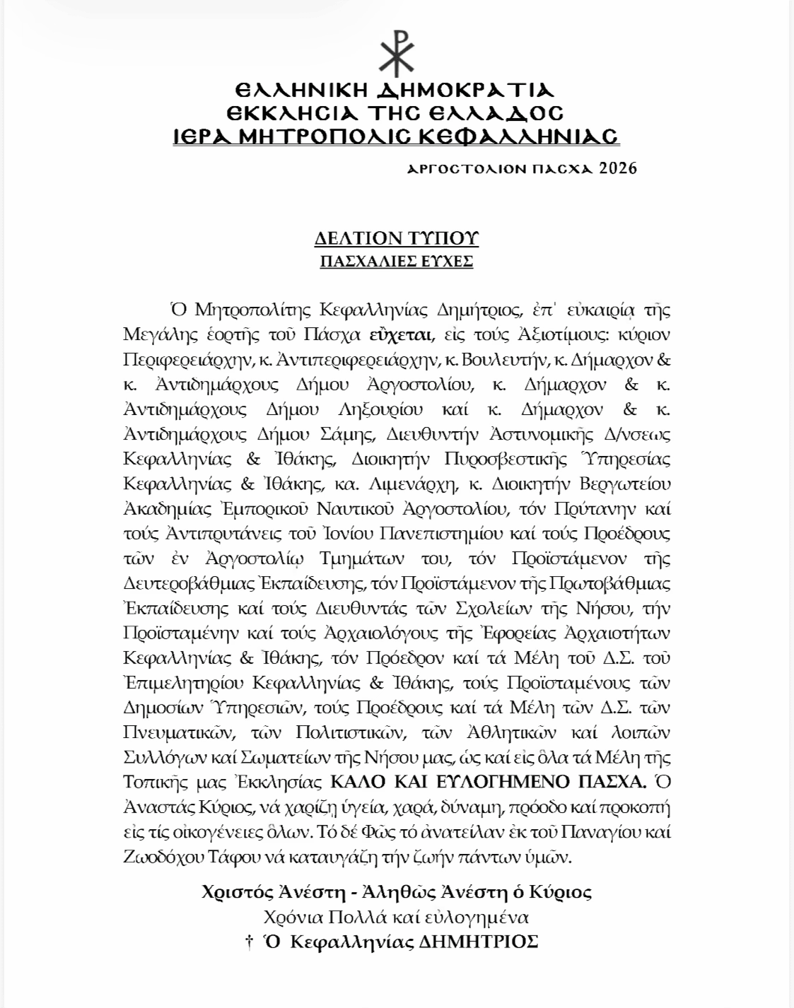 Πασχάλιες ευχές έτους 2026 του Σεβ. Μητροπολίτου Κεφαλληνίας κ. Δημητρίου ΕΚΚΛΗΣΙΑ Newsroom 06/04/2026 ΓΡΑΦΕΙ Ο ΜΑΚΗΣ ΛΕΚΑΤΣΑΣ 06/04/2026 06/04/2026 06/04/2026 Share FacebookXPinterestWhatsApp ΠΑΡΟΜΟΙΑ ΑΡΘΡΑ Previous articleΝέο Εφορευτικό Συμβούλιο στην Ιακωβάτειο Βιβλιοθήκη – Με αίσθημα ευθύνης για τη συνέχιση του έργου και την αποκατάσταση του ιστορικού κτηρίου ΣΧΟΛΙΑ ΧΡΗΣΤΩΝ ΤΕΛΕΥΤΑΙΑ ΝΕΑ Νέο Εφορευτικό Συμβούλιο στην Ιακωβάτειο Βιβλιοθήκη – Με αίσθημα ευθύνης για... 06/04/2026 Το Κοργιαλένειο Μουσείο τιμά τα 200 χρόνια από την Έξοδο του... 06/04/2026 Διονύσης Λυκούδης: Ο Σπύρος Στρακάτος τομεάρχης για τη Νέα Γενιά και... 06/04/2026 Το υπερπολυτελές «Four Seasons I»:η πιο ακριβή εμπειρία κρουαζιέρας στον κόσμο... 05/04/2026 Πρόγραμμα Ακολουθιών Μεγάλης Εβδομάδος στον Ι.Ν. Παμμεγίστων Ταξιαρχών Αργοστολίου 05/04/2026