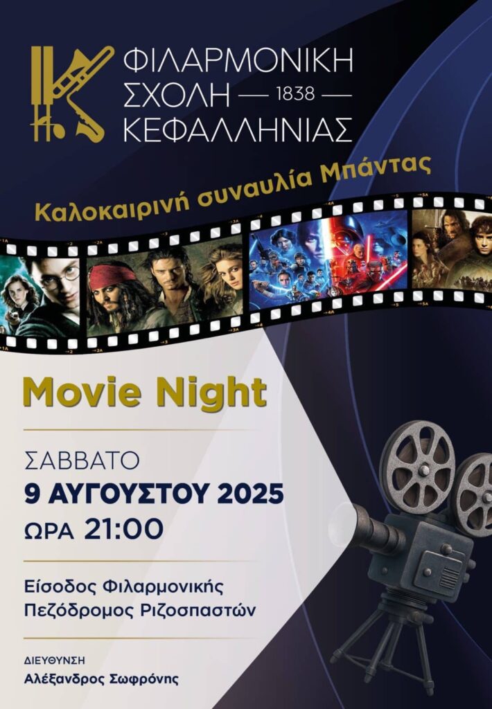 Η Φιλαρμονική Σχολή Κεφαλληνίας παρουσιάζει μια βραδιά αφιερωμένη στην κινηματογραφική μουσική. Η Μπάντα, με τη βοήθεια διάσημων soundtracks,