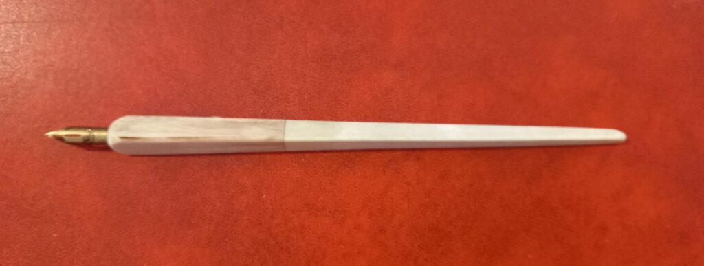 Η πένα είχε προσφερθεί για την Έκθεση από τον Κωνσταντίνο Λασκαράτο, εγγονό του Γεράσιμου, αδελφού του Ανδρέα Λασκαράτου. Ταυτόχρονα, ο Κων. Λασκαράτος με βάση σχετικό συμφωνητικό (Πειραιάς, 25-7-2001) ανάμεσα στον ίδιο και εκπρόσωπο της Ιακωβατείου Βιβλιοθήκης, δώρισε τη συγκεκριμένη πένα στον τότε Δήμο Παλικής – σήμερα Δήμο Ληξουρίου – προκειμένου να αποτελέσει μόνιμο έκθεμα του «Μουσείου Λασκαράτου», η ίδρυση του οποίου εξακολουθεί να αποτελεί στόχο του τοπικού Δήμου. Μέχρι τότε, βέβαια, η πένα εκτίθεται στον εκθεσιακό χώρο (τώρα Αίθουσα Τέχνης) της Ιακωβατείου Βιβλιοθήκης.