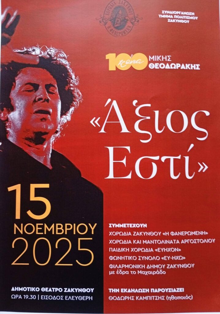 Που διοργανώνει η Χορωδία της ΦΑΝΕΡΩΜΕΝΗΣ , για τον μεγάλο μας Μίκη Θεοδωράκη , το Σάββατο 15.11.25 στο ΔΗΜΟΤΙΚΌ ΘΕΑΤΡΟ ΖΑΚΥΝΘΟΥ .
