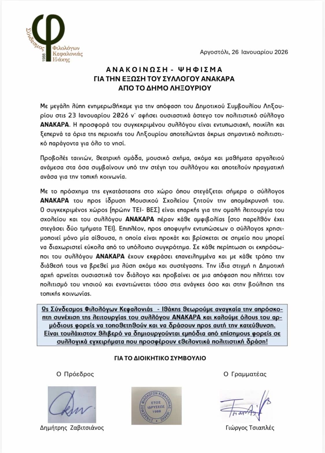 Ψήφισμα του Συνδέσμου Φιλολόγων Κεφαλονιάς – Ιθάκης για την έξωση του συλλόγου “ΑΝΑΚΑΡΑ” ΠΟΛΙΤΙΣΜΟΣ Newsroom 26/01/2026 ΓΡΑΦΕΙ Ο ΜΑΚΗΣ ΛΕΚΑΤΣΑΣ 26/01/2026 26/01/2026 26/01/2026 Share FacebookTwitterPinterestWhatsApp ΠΑΡΟΜΟΙΑ ΑΡΘΡΑ Previous articleΤιμή στη μνήμη του Καθηγητή Φώτη Παυλάτου από το Ίδρυμα Γεωργίου και Μάρης ΒεργωτήNext articleΙερά Αγρυπνία και Κοπή Αγιοβασιλόπιτας στην Ιερά Μονή Γενεσίου Θεοτόκου Άτρου προς τιμήν της Υπαπαντής του Κυρίου ΣΧΟΛΙΑ ΧΡΗΣΤΩΝ LEAVE A REPLY Cancel reply Comment: Please enter your comment! Name:* Please enter your name here Email:* You have entered an incorrect email address! Please enter your email address here Website: Save my name, email, and website in this browser for the next time I comment. ΤΕΛΕΥΤΑΙΑ ΝΕΑ Σεμινάριο παραδοσιακών χορών στο Θέατρο «Δώρα Στράτου» από τον Δημήτρη Μαντζουράτο 26/01/2026 Ο δημοσιογράφος της ΕΡΤ Γιώργος Κουβαράς συγκίνησε τραγουδώντας για τους Ιθακήσιους... 26/01/2026 Βιολάντα: Από φούρνος γειτονιάς σε επιχειρηματικό case study – Πώς εκτοξεύτηκε... 26/01/2026 Βάνια Σαμόλη :Από καρδιάς ευχαριστώ—ένα συλλογικό εγχείρημα που γέμισε το θέατρο,... 26/01/2026 Σταύρος Αντύπας:Όταν οι μικρές εξουσίες φοβούνται: στο στόχαστρο τα ζωντανά συλλογικά... 26/01/2026