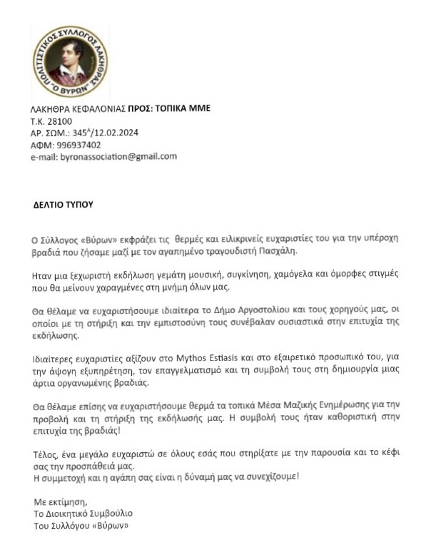 Π.Σ.«Ο ΒΥΡΩΝ»:Θερμές Ευχαριστίες σε όλους όσους βοήθησαν για την βραδιά με τον Πασχάλη ΠΟΛΙΤΙΣΜΟΣ Newsroom 24/02/2026 ΓΡΑΦΕΙ Ο ΜΑΚΗΣ ΛΕΚΑΤΣΑΣ 24/02/2026 24/02/2026 24/02/2026 Share FacebookTwitterPinterestWhatsApp ΠΑΡΟΜΟΙΑ ΑΡΘΡΑ Previous article«Όχι στη Μετατροπή του Σχολείου σε Διαγωνιστικό Στίβο» – Παρέμβαση του Σύλλογου Εκπαιδευτικών Π/θμιας για τους Διαγωνισμούς ΜαθηματικώνNext article«Πού Πήγε το Παιδί;» – Σκέψεις για τη Βία, την Απουσία και την Ευθύνη της Κοινωνίας Απέναντι στα Παιδιά μας ΣΧΟΛΙΑ ΧΡΗΣΤΩΝ ΤΕΛΕΥΤΑΙΑ ΝΕΑ Εικόνες που δεν τιμούν την Πεσσάδα:Χωματερή δίπλα στην εκκλησία του Αποστόλου... 24/02/2026 Η Θάλασσα «Άνοιξε» το λιμάνι της Πεσσάδας: Σοβαρές ζημιές από την... 24/02/2026 “Ασφάλεια στη δουλειά για όλους!”, ο φετινός χαρταετός του Οδοντιατρικού Συλλόγου... 24/02/2026 Δ.Αραβαντινός: Η νότια Παλική σε κρίσιμο σημείο: Η διάβρωση απειλεί το... 24/02/2026 Δήμος Αργοστολίου :Ιδιαίτερες ευχαριστίες σε όλους όσοι συνέβαλαν στην επιτυχία των ... 24/02/2026