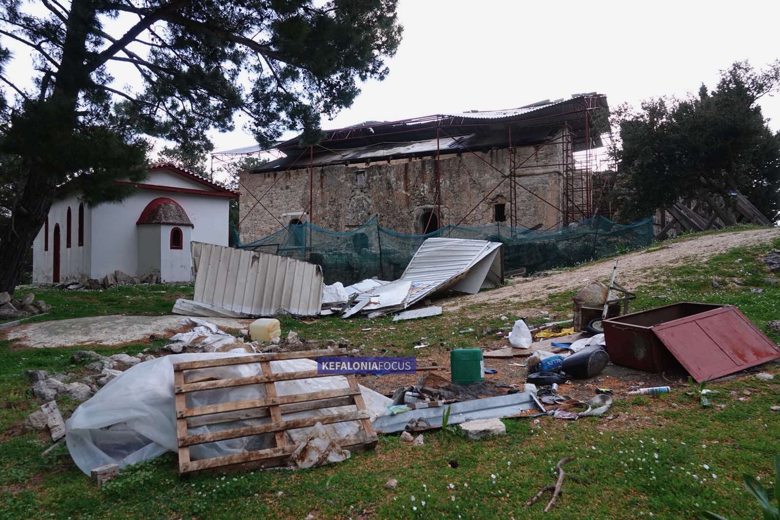Η Βυζαντινή Ιερά Μονή Αγίων Φανέντων στη Σάμη, ένα μνημείο με ιστορία που ξεκινά από τον 13ο αιώνα, βρίσκεται σήμερα στο επίκεντρο μιας εικόνας που δεν τιμά ούτε την πολιτιστική μας κληρονομιά ούτε το ίδιο το έργο αποκατάστασης που έχει εγκριθεί για την προστασία της. Λαμαρίνες από το προστατευτικό στέγαστρο είναι πεταμένες στον περιβάλλοντα χώρο, το στέγαστρο έχει διαλυθεί και ο χώρος γύρω από το μνημείο θυμίζει εγκαταλελειμμένο εργοτάξιο.