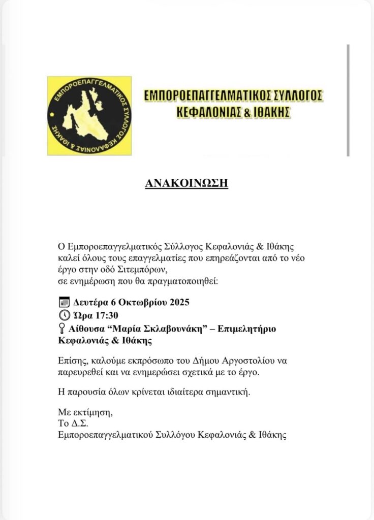 Εμποροεπαγγελματικός Συλλόγος Κάλεσμα στους επαγγελματίες για ενημέρωση για το έργο της οδού Σιτεμπόρων ΟΙΚΟΝΟΜΙΑ Newsroom 05/10/2025 ΓΡΑΦΕΙ Ο ΜΑΚΗΣ ΛΕΚΑΤΣΑΣ 05/10/2025 05/10/2025 05/10/2025 Share FacebookTwitterPinterestWhatsApp ΠΑΡΟΜΟΙΑ ΑΡΘΡΑ Previous articleΗ νύχτα ως σύμβολο αυτογνωσίας.Γράφει ο Γιάννης ΚοσμάτοςNext articleNational League 2:Νικηφόρα πρεμιέρα για τον ΝΕΟΛ – Επικράτησε της ΑΕ Βαρθολομιού στη Γαστούνη με 84-80 ΣΧΟΛΙΑ ΧΡΗΣΤΩΝ LEAVE A REPLY Cancel reply Comment: Please enter your comment! Name:* Please enter your name here Email:* You have entered an incorrect email address! Please enter your email address here Website: Save my name, email, and website in this browser for the next time I comment. ΤΕΛΕΥΤΑΙΑ ΝΕΑ Τα Ιόνια Νησιά στο επίκεντρο της Νέας Υόρκης 23/01/2026 Π. Καππάτος: Νέα Κατανομή Κονδυλίων για τα Σχολεία του Νομού μας 23/01/2026 Τακτική Συνεδρίαση της Επιτροπής Τουριστικής Ανάπτυξης Δήμου Αργοστολίου – Παρουσίαση Μελέτης... 23/01/2026 Το Ίδρυμα Φωκά-Κοσμετάτου αποχαιρετά τον Σπύρο Κοσμετάτο 23/01/2026 Εορταστικές δράσεις και μηνύματα αλληλεγγύης από τα ΚΑΠΗ Κεφαλληνίας 23/01/2026