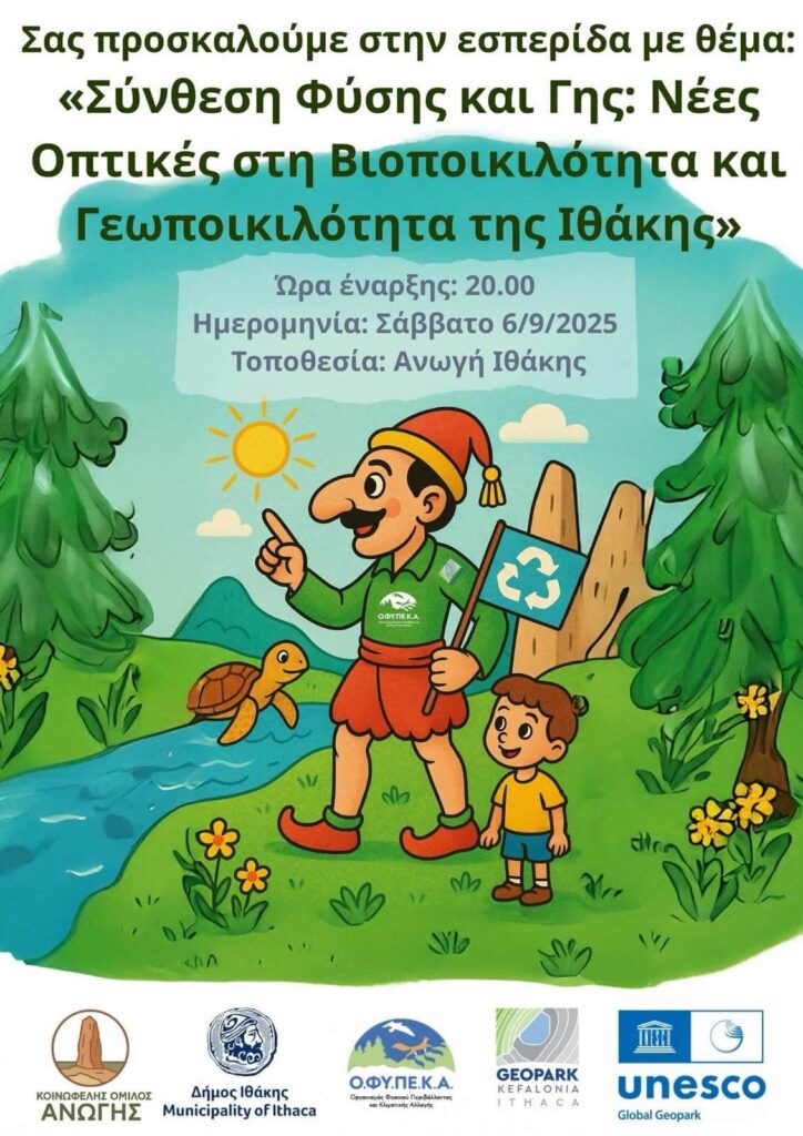 Αργοστόλι, Πέμπτη, 4 Σεπτεμβρίου 2025– Το Σάββατο 6 Σεπτεμβρίου, το Παράρτημα Αργοστολίου της Μονάδας Διαχείρισης Εθνικών Πάρκων Ζακύνθου Αίνου & Προστατευόμενων Περιοχών Ιονίων Νήσων και το Παγκόσμιο Γεωπάρκο UNESCO Κεφαλονιάς-Ιθάκης που διαχειρίζεται ο ΟΦΥΠΕΚΑ, σε συνεργασία με τον Δήμο Ιθάκης και τον Τοπικό Όμιλο Ανωγής, προσκαλούν το κοινό να συμμετέχει στην εσπερίδα που θα πραγματοποιηθεί στην Ανωγή Ιθάκης με τίτλο: «Σύνθεση Φύσης και Γης: Νέες οπτικές στη βιοποικιλότητα και γεωποικιλότητα της Ιθάκης».