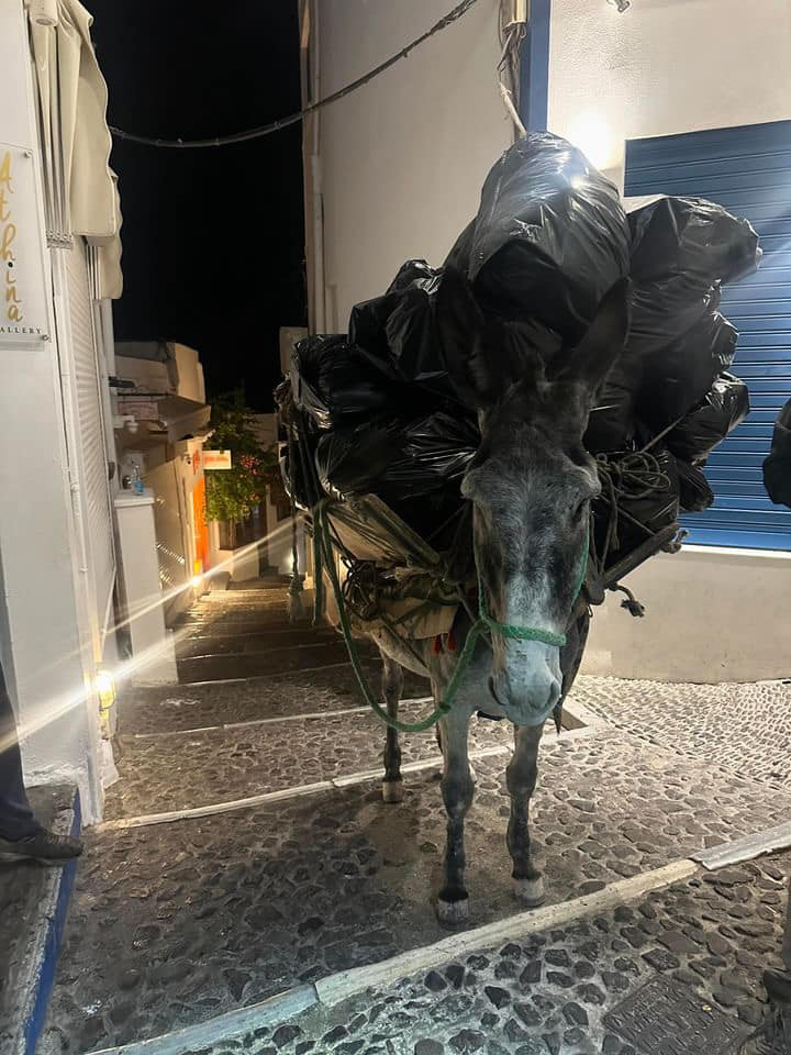 Σύμφωνα με την καταγγελία γαιδουράκια και μουλάρια που όταν δεν μεταφέρουν τουρίστες, κουβαλάνε τα σκουπίδια του νησιού και υποχρεώνονται σε εξαντλητική εργασία με τις Αρχές να κλείνουν τα μάτια στην παραβίαση ακόμη και αυτών των ελάχιστων κανόνων προστασίας και ευζωίας των ζώων αυτών που αποτελούν διεθνώς μελανό σημείο για την εικόνα του συγκεκριμένου νησιού.