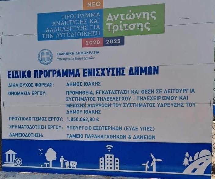 Με ιδιαίτερη ικανοποίηση βλέπουμε να προχωρά η υλοποίηση ενός σημαντικού έργου για τον Δήμο Ιθάκης, που αφορά την εγκατάσταση συστήματος τηλεμετρίας και ελέγχου διαρροών στο δίκτυο ύδρευσης, συνολικού προϋπολογισμού 1.850.092,00 ευρώ μέσω του προγράμματος Αντώνης Τρίτσης.
