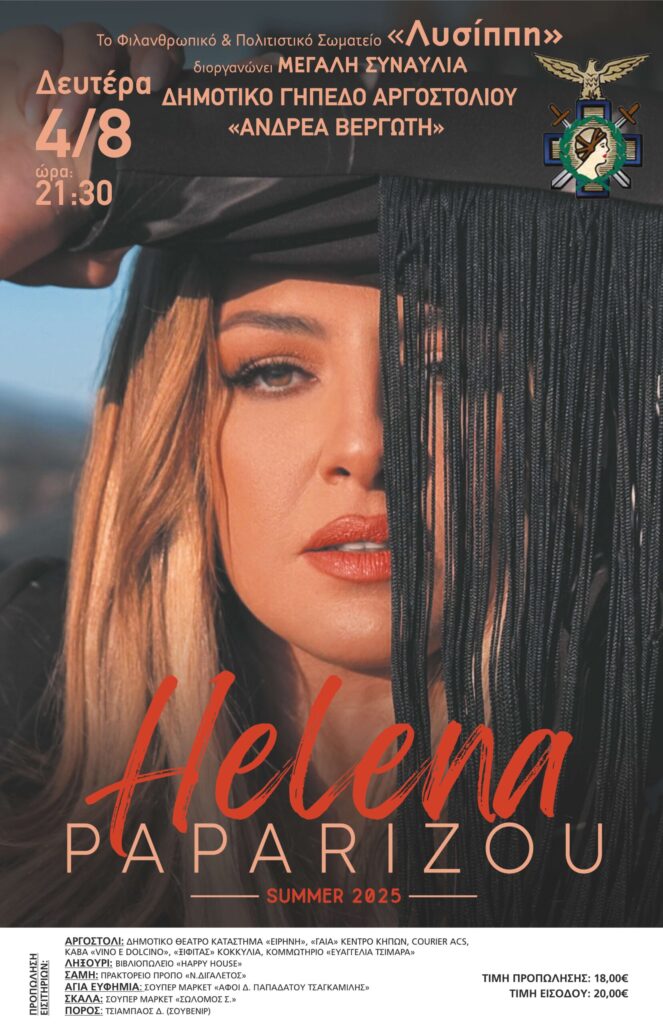 Η Έλενα Παπαρίζου θα εμφανιστεί σε μια ξεχωριστή συναυλία αγάπης που διοργανώνει το Φιλανθρωπικό & Πολιτιστικό Σωματείο «ΛΥΣΙΠΠΗ» στις 4 Αυγούστου 2025 στην Κεφαλονιά. Η συναυλία έχει φιλανθρωπικό χαρακτήρα, καθώς όλα τα έσοδα θα διατεθούν για την ενίσχυση της Παιδιατρικής Κλινικής του Γενικού Νοσοκομείου Αργοστολίου, προσφέροντας στήριξη στους μικρούς ασθενείς και τις οικογένειές τους .