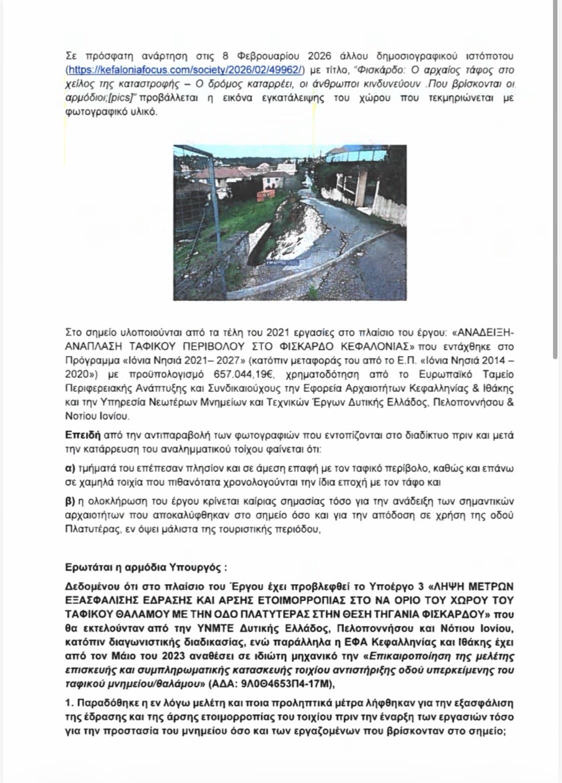 Στο ανώτατο επίπεδο κοινοβουλευτικού ελέγχου έφτασε πλέον το σοβαρό ζήτημα της κατάρρευσης του οδοστρώματος στην είσοδο του Φισκάρδου, στο σημείο της Πλατυτέρας, όπου παραμένει εκτεθειμένος αρχαίος τάφος στο πρανές του δρόμου.