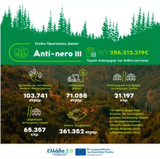 Το έργο, συνολικά, έχει πάρα πολλές παρεμβάσεις μέσα. Είναι σχέδιο μελέτης, όμως αυτή τη στιγμή εκτελούνται αυτά που προαναφέραμε. Δηλαδή πέραν του καθαρισμού των 208 χιλιομέτρων, τη διάνοιξη τεσσάρων δρόμων αντιπυρικής προστασίας αλλά και τις δέκα δεξαμενές, σε επόμενη χρηματοδότηση, στο AntiΝero 4 ή 5 αν μπορέσουμε να ενταχθούμε, ο αριθμός θα μεγαλώσει.