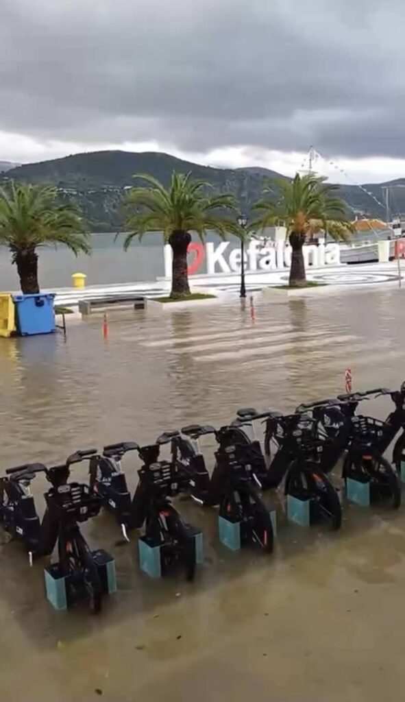 Το Σύστημα Κοινόχρηστων Ποδηλάτων του Δήμου Αργοστολίου, το οποίο εγκαταστάθηκε έξω από τον Οίκο Ευγηρίας στην παραλιακή λεωφόρο Α. Τρίτση, βρίσκεται τις τελευταίες ημέρες κυριολεκτικά… μέσα στα νερά. Οι επαναλαμβανόμενες πλημμύρες στο συγκεκριμένο σημείο της παραλιακής – ένα πρόβλημα που εμφανίζεται πλέον σχεδόν καθημερινά – έχουν μετατρέψει τον σταθμό ποδηλάτων σε «νησίδα» βυθισμένη μέσα σε λιμνάζοντα ύδατα.