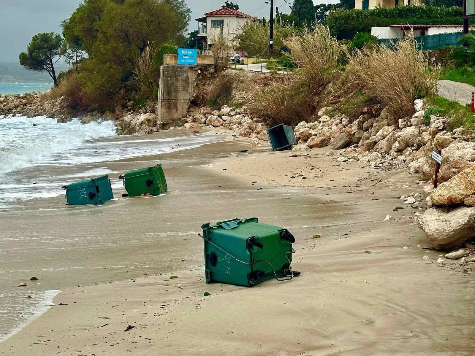 Οι κάδοι που ήταν τοποθετημένοι κατά μήκος της παραλίας, χωρίς καμία πρόβλεψη, χωρίς δέσιμο, χωρίς έλεγχο, «ταξίδεψαν» με τον αέρα, μετατρέποντας μία από τις πιο γνωστές παραλίες της Κεφαλονιάς σε εικόνα ντροπής. Μια εικόνα που δεν τιμά ούτε τον τόπο, ούτε τον τουρισμό, ούτε τη στοιχειώδη έννοια της ευθύνης.