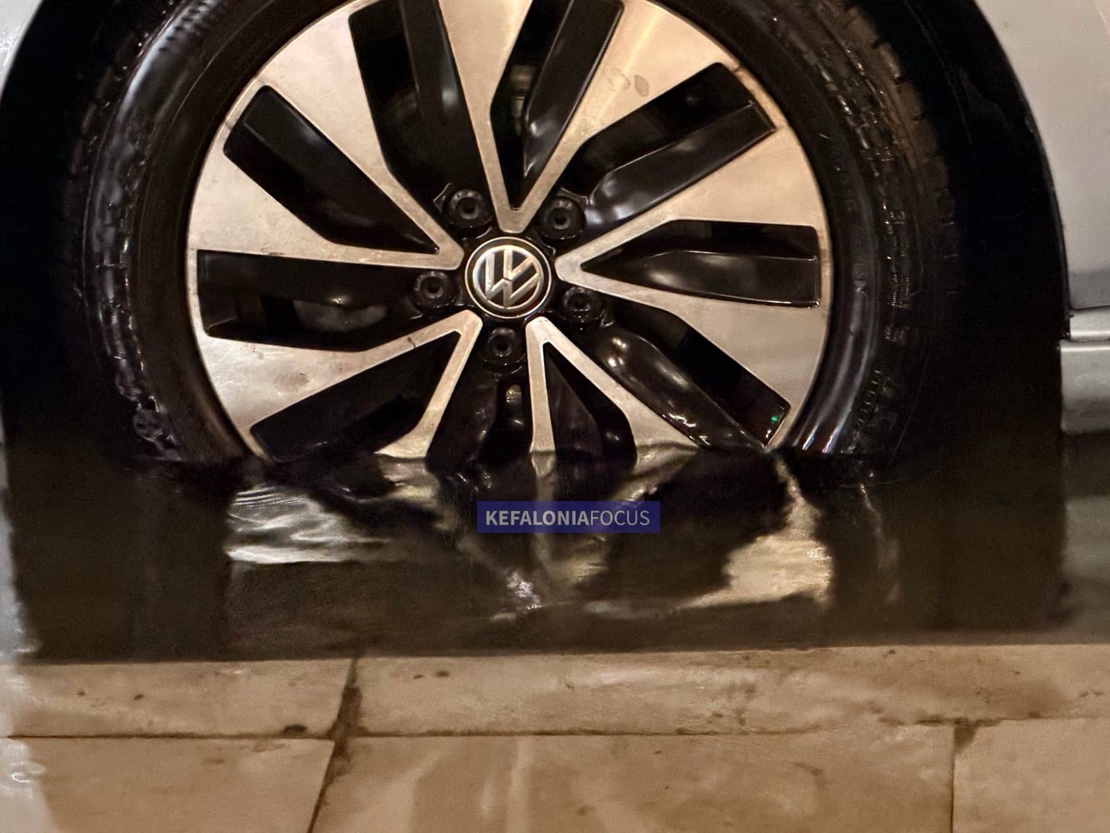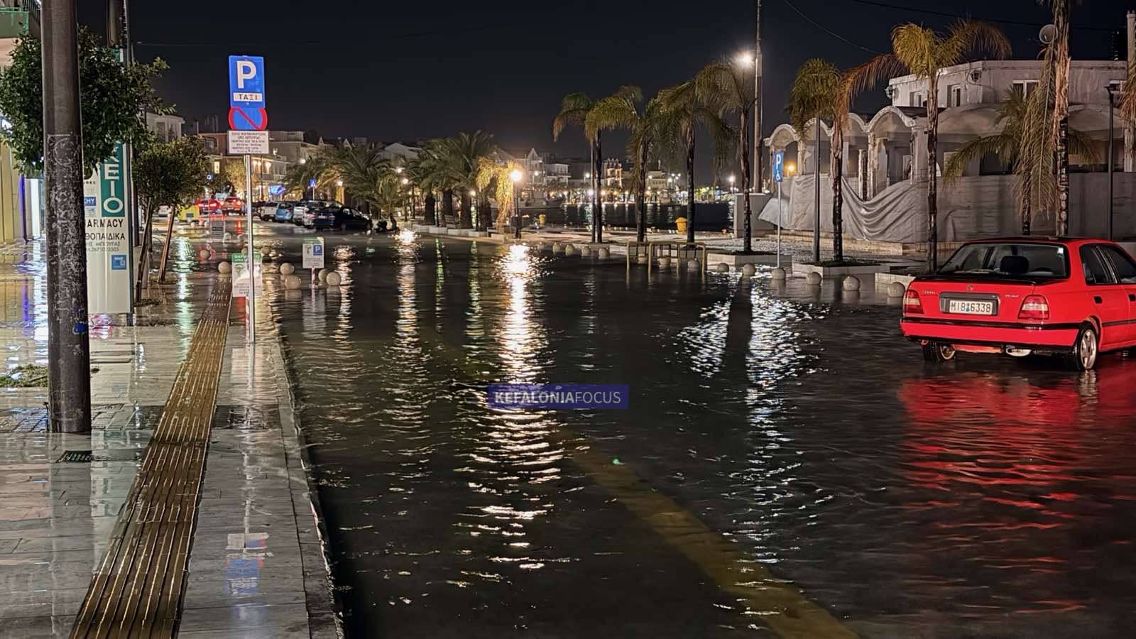 Ώρες μετά το τέλος της έντονης βροχόπτωσης, η κατάσταση στην παραλιακή οδό του Αργοστολίου εξακολουθεί να είναι δραματική. Τα νερά παραμένουν σε αμετάβλητη στάθμη, χωρίς ουσιαστική υποχώρηση, μετατρέποντας ένα από τα πιο κεντρικά σημεία της πόλης σε απροσπέλαστο χώρο για οχήματα και πεζούς.