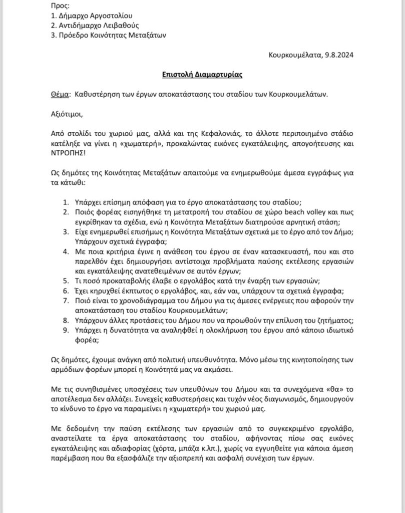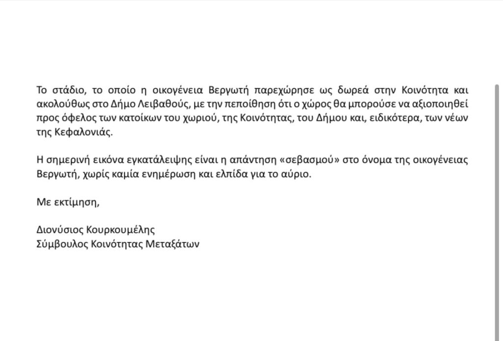 Επιστολή διαμαρτυρίας του Διονύση Κουρκουμέλη για την αποκατάσταση του σταδίου των Κουρκουμελάτων ΚΟΙΝΩΝΙΑ Newsroom 10/08/2024 ΓΡΑΦΕΙ Ο ΜΑΚΗΣ ΛΕΚΑΤΣΑΣ 10/08/2024 10/08/2024 10/08/2024 Share FacebookTwitterPinterestWhatsApp ΠΑΡΟΜΟΙΑ ΑΡΘΡΑ Previous articleBleu de Nimes – Αυτό είναι το yacht που παραλίγο να συγκρουστεί με το Nydri Star 1Next articleΑΝΑΣΑ: Ασθενοφόρα ακούμε κι ασθενοφόρα δεν βλέπουμε στα Ιόνια Νησιά ΣΧΟΛΙΑ ΧΡΗΣΤΩΝ LEAVE A REPLY Cancel reply Comment: Please enter your comment! Name:* Please enter your name here Email:* You have entered an incorrect email address! Please enter your email address here Website: Save my name, email, and website in this browser for the next time I comment. ΤΕΛΕΥΤΑΙΑ ΝΕΑ Κώστας Ανεστίδης: Έξω από το Μαξίμου, μέσα στην αγωνία της αγροτιάς—«Μάλλον... 19/01/2026 Απογραφή Στρατευσίμων γεννηθέντων τα έτη 2008 και 2009 19/01/2026 90 χρόνια ιστορίας και ενότητας: Ο Σύλλογος Φαρσινών Πειραιά «Ο Άγιος... 19/01/2026 Πρόσκληση σε δύο συνεδριάσεις του ΔΣ Ληξουρίου 19/01/2026 “Από τα αλώνια στα Σαλόνια”. Πρόγραμμα και λεξικό 19/01/2026