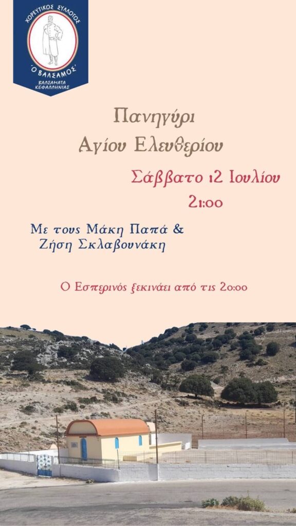Ο Χορευτικός Όμιλος «Ο Βάλσαμος» σας προσκαλεί στο καθιερωμένο πανηγύρι στον Άγιο Ελευθέριο, στο βουνό του Αίνου, το Σάββατο 12 Ιουλίου 2025. Η βραδιά ξεκινά στις 21:00 με πλούσιο μπουφέ και ζωντανή μουσική από την ορχήστρα των Ζήση Σκλαβουνάκη και Μάκη Παπά. Σας περιμένουμε όλους για ένα αξέχαστο γλέντι με κέφι, χορό και παράδοση, στο μαγευτικό τοπίο του Αίνου.