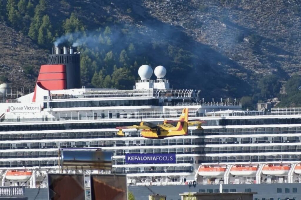 Εντυπωσιακές πτήσεις του Canadair CL –215 με φόντο το κρουαζιερόπλοιο Queen Victoria στο Αργοστόλι