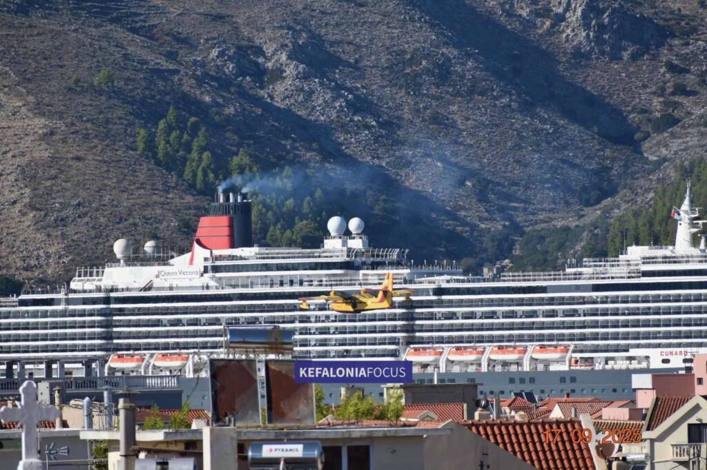 Ένα σπάνιο και άκρως εντυπωσιακό θέαμα είχαν την ευκαιρία να απολαύσουν οι κάτοικοι και οι επισκέπτες του Αργοστολίου, όταν το Canadair CL-215 της Πολεμικής Αεροπορίας πραγματοποιούσε υδροληψίες από τον κόλπο, την ώρα που στο λιμάνι βρισκόταν αγκυροβολημένο το πολυτελές κρουαζιερόπλοιο Queen Victoria.