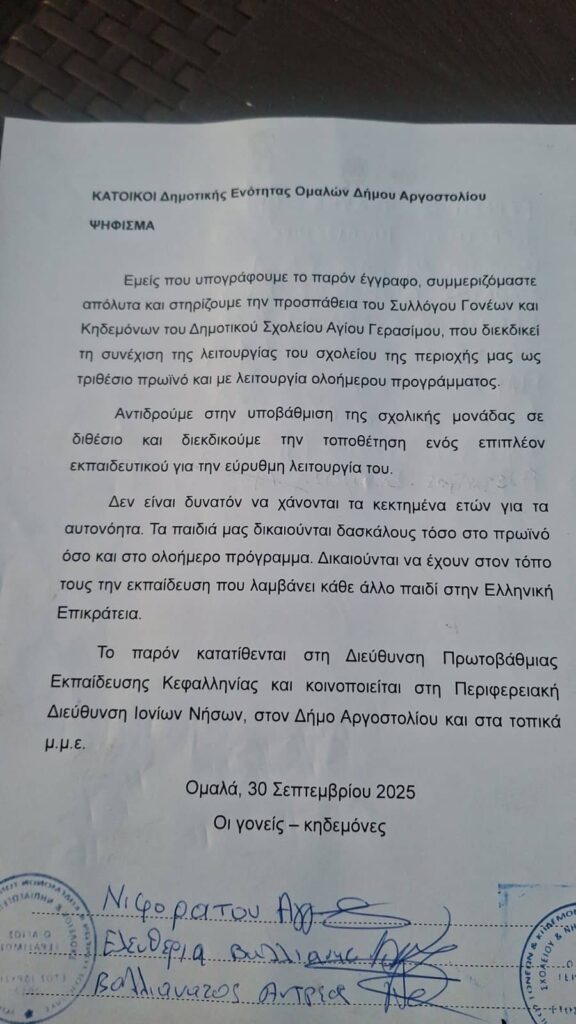 Οι γονείς των μαθητών, εκφράζοντας την έντονη ανησυχία τους, απέστειλαν επιστολή προς τις αρμόδιες αρχές ζητώντας την άμεση ανάκληση της απόφασης.