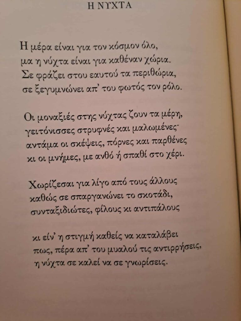Στην πρώτη κιόλας στροφή εμφανίζεται αυτό το δίπολο. Η μέρα ανήκει στο σύνολο, στη μάσκα που φοράμε όταν βρισκόμαστε ανάμεσα στους άλλους. Η νύχτα αντίθετα είναι προσωπική, μυστική. Τότε, ο καθένας από μας βρίσκεται αντιμέτωπος με τον εαυτό του. Το ποίημα μας λέει: