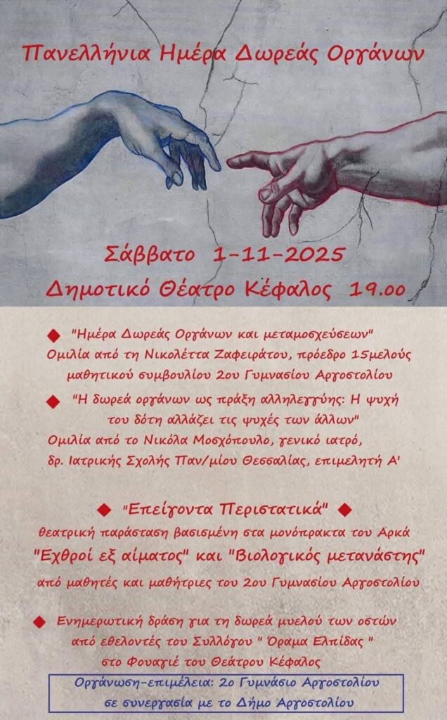 Το 2ο Γυμνάσιο Αργοστολίου τιμώντας την Πανελλήνια Ημέρα Δωρεάς Οργάνων θα διοργανώσει σε συνεργασία με το Δήμο Αργοστολίου εκδήλωση, η οποία θα αναδεικνύει τη σημασία της αλληλεγγύης, της προσφοράς και της ανθρωπιάς. Μέσα από λόγο, μουσική και θεατρικά δρώμενα, οι μαθητές και οι μαθήτριες του σχολείου θα μεταφέρουν ένα μήνυμα ζωής και ελπίδας, υπογραμμίζοντας ότι η δωρεά οργάνων δεν είναι μόνο μια ιατρική πράξη, αλλά η γέφυρα που συνδέει ψυχές, ακόμα και όταν αυτές δεν έχουν γνωριστεί ποτέ.