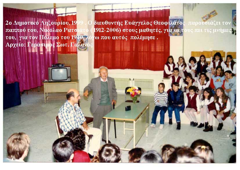 Στο σχολικό πλαίσιο των εκδηλώσεων του 2ουΔημοτικού Σχολείου Ληξουρίου, κατά το έτος 1999, η πρότασή μου ήταν, να βρούμε παλιούς ανθρώπους που να είχαν συμμετάσχει, είχαν πολεμήσει σε εκείνον τον αγώνα, ενάντια στους Ιταλούς και να μας καταθέσουν τις μνήμες τους.