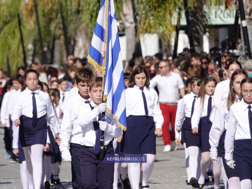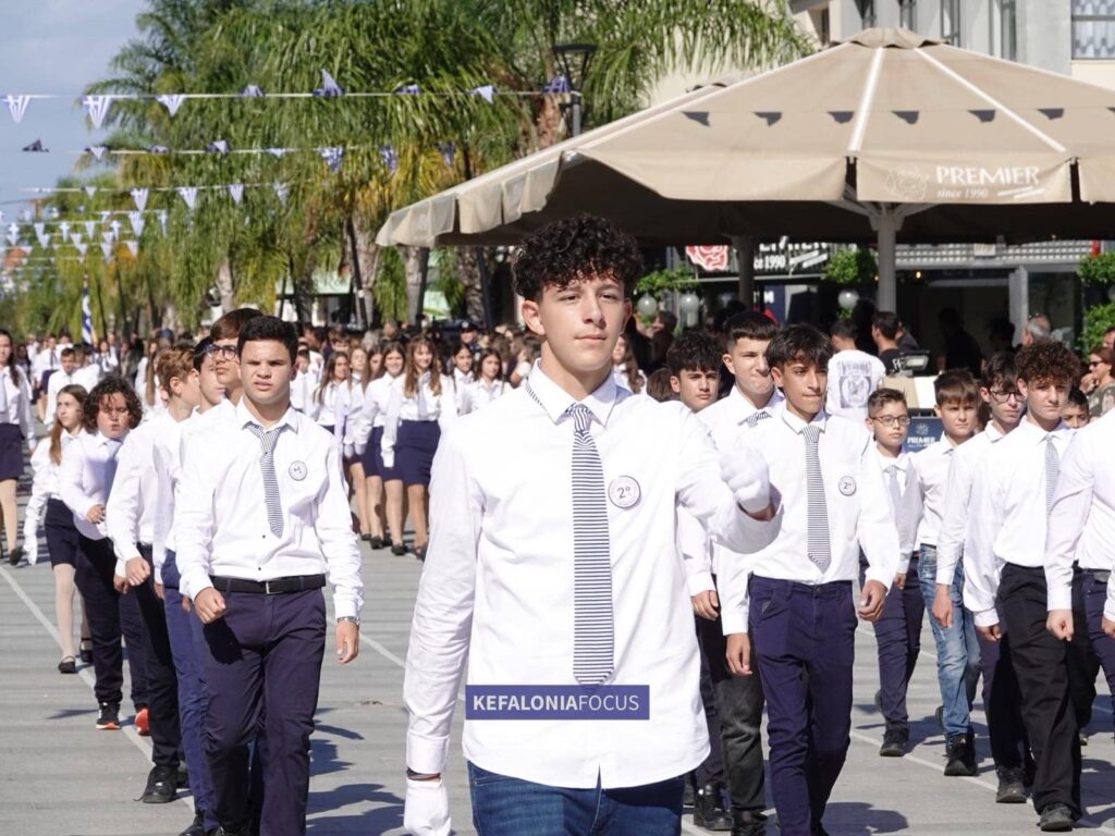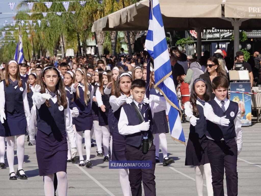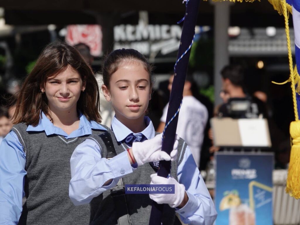 Η κορύφωση του εορτασμού ήρθε με τη μαθητική παρέλαση που πραγματοποιήθηκε στην παραλιακή λεωφόρο του Αργοστολίου. Η μαθητιώσα νεολαία της Πρωτοβάθμιας και Δευτεροβάθμιας Εκπαίδευσης παρέλασε με περηφάνια, κρατώντας ψηλά τη γαλανόλευκη, αποσπώντας το θερμό χειροκρότημα των πολιτών που κατέκλυσαν την κεντρική πλατεία .