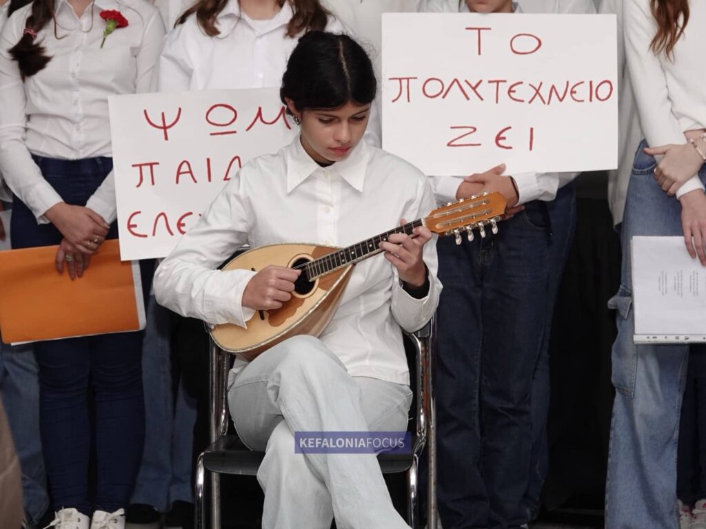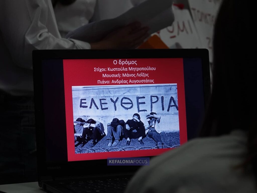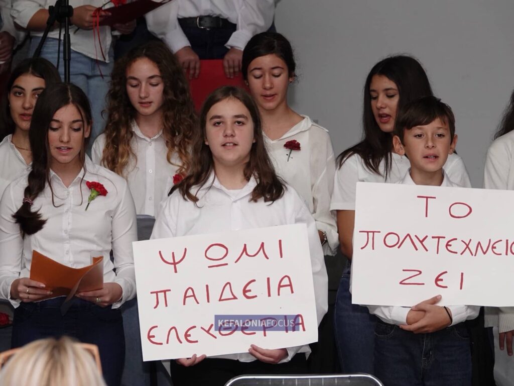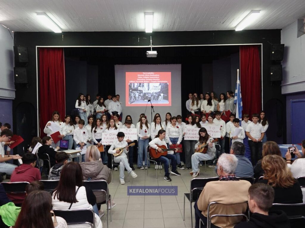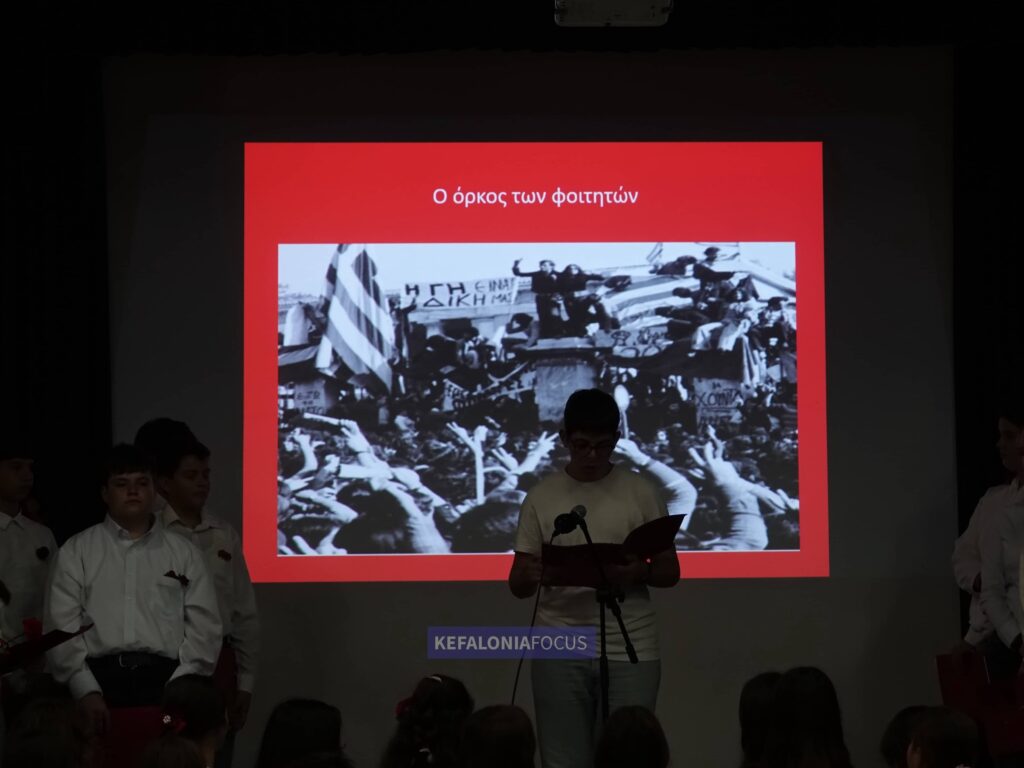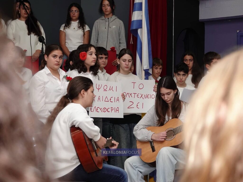 Την κατάμεστη Λυκιαρδοπούλειο αίθουσα του σχολείου πλημμύρισαν υπέροχες μελωδίες από κιθάρες, πιάνο, μαντολίνο που έπαιξαν τα παιδιά ,και τραγούδια, που απέδωσε εξαιρετικά η χορωδία, ενώ μαθήτριες και μαθητές απήγγειλαν,με τρόπο συγκινητικό, ποιήματα για το έπος του Πολυτεχνείου.