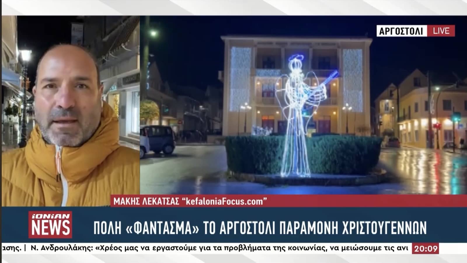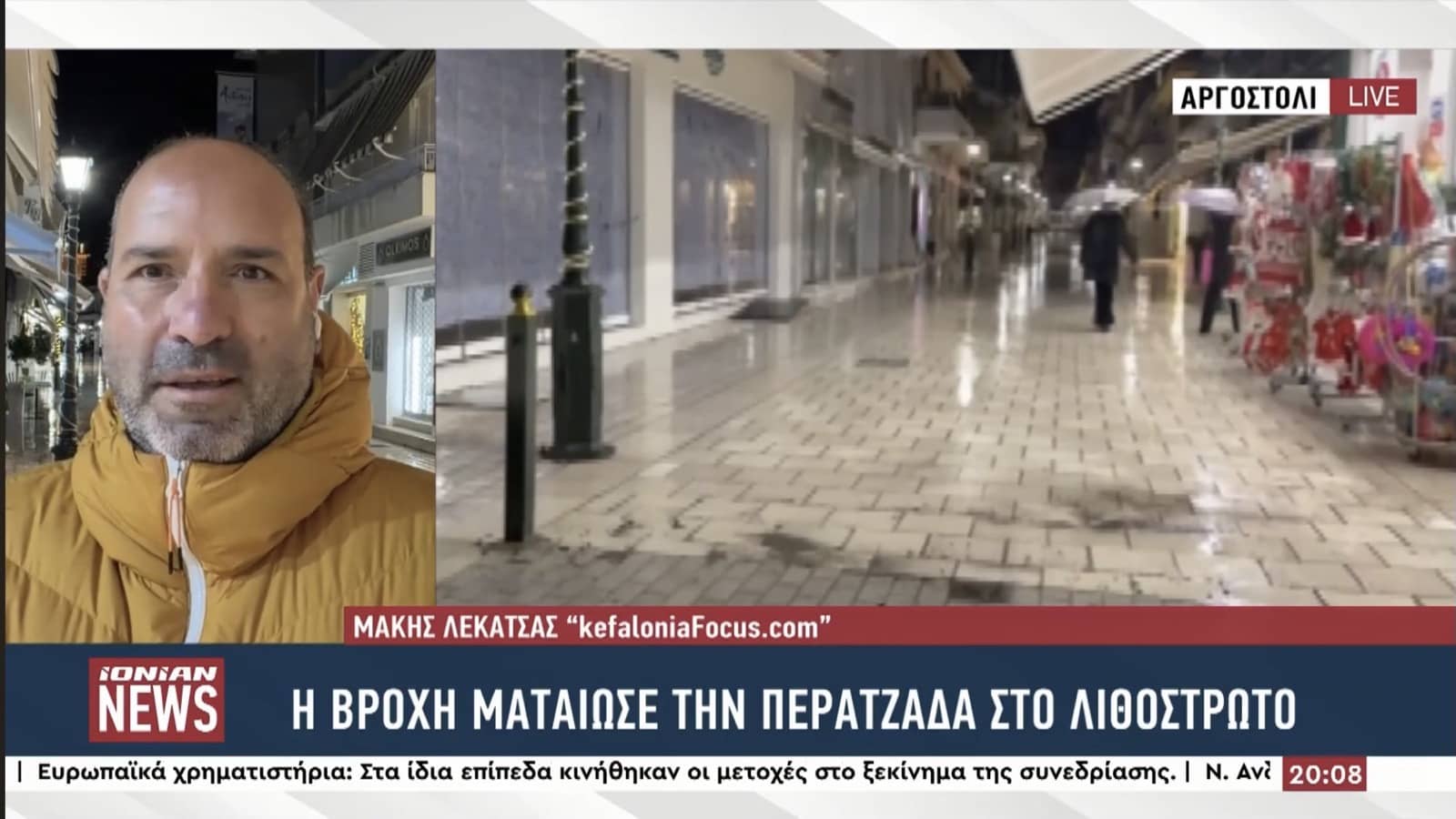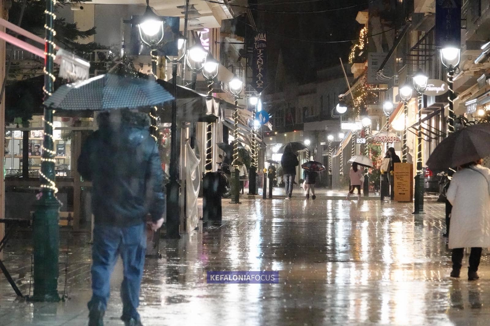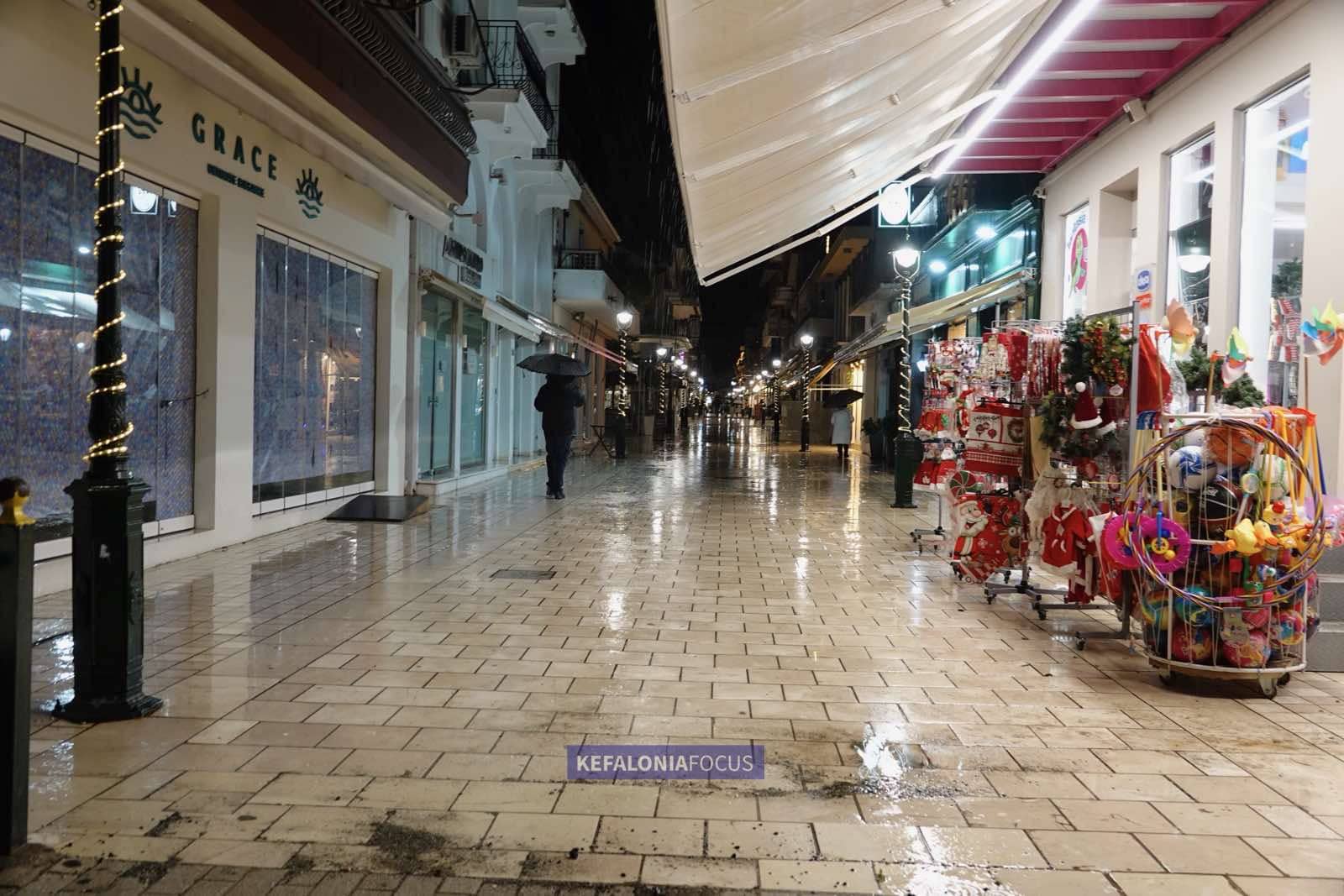 Αποκαρδιωτική ήταν η εικόνα που παρουσίασε το Αργοστόλι την Παραμονή των Χριστουγέννων, σε μια βραδιά που παραδοσιακά πλημμυρίζει από κόσμο, μουσικές και εορταστική διάθεση. Η κακοκαιρία, με τη συνεχή και έντονη βροχόπτωση, στάθηκε καθοριστικός παράγοντας, αποτρέποντας τη διεξαγωγή της καθιερωμένης περατζάδας των κανταδόρων στο Λιθόστρωτο και στο κέντρο της πόλης.