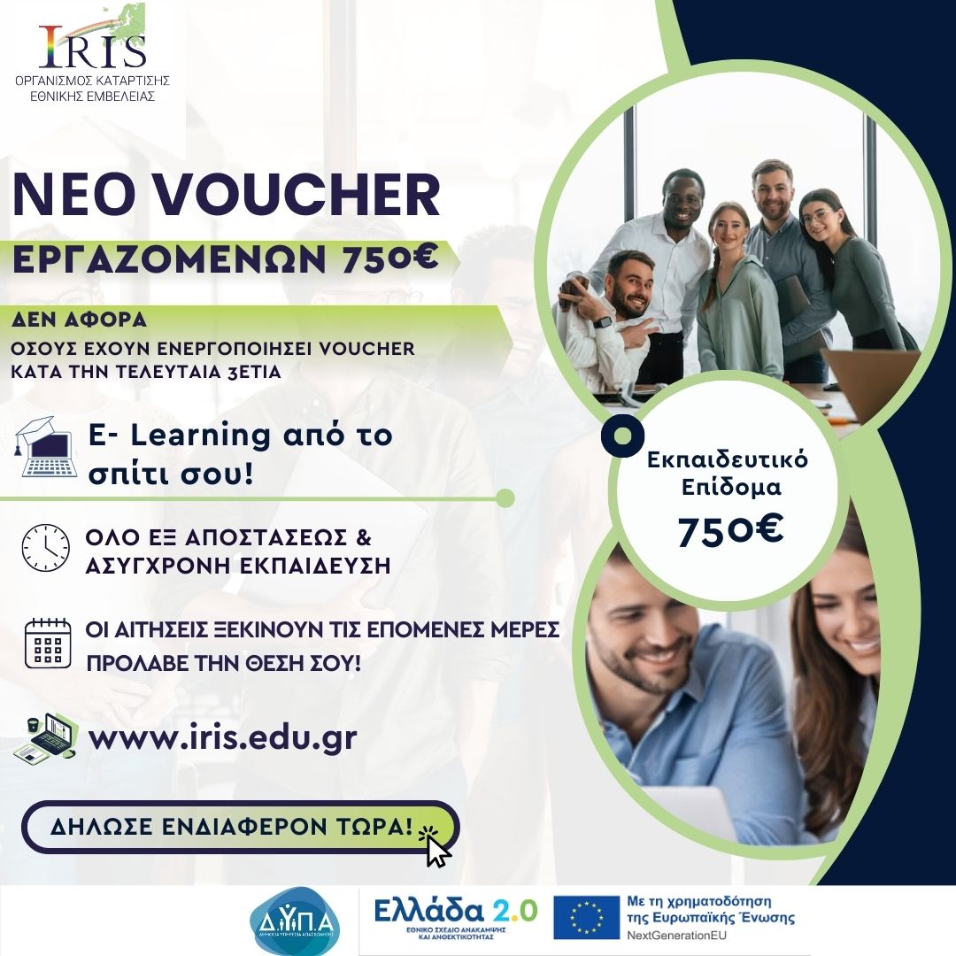 Νέο Πρόγραμμα Εργαζομένων 100% Ασύγχρονη Εκπαίδευση με Εκπαιδευτικό Επίδομα έως 750 ευρώ. NEO εξ αποστάσεως επιδοτούμενο πρόγραμμα κατάρτισης και πιστοποίησης που απευθύνεται αποκλειστικά σε εργαζομένους του ιδιωτικού τομέα.Στέλνετε τα δικαιολογητικά σας, στο παρακάτω email: kefalonia@iris.edu.gr📩 ΔΙΚΑΙΟΛΟΓΗΤΙΚΑΜπορείτε να δηλώσετε συμμετοχή αποστέλλοντας τα παρακάτω δικαιολογητικά:ΤαυτότηταΤίτλος Σπουδών (Να είναι απόφοιτοι τουλάχιστον υποχρεωτικής εκπαίδευσης. Επιλέξιμοι είναι και οι απόφοιτοι Δημοτικού που αποφοίτησαν το σχολικό ετος 1979 – 1980)ΙΒΑΝ στο οποίο να είστε πρώτος/η δικαιούχοςΨηφιακό ωράριο εργασίαςΥπεύθυνη δήλωση μέσω GOV με κείμενο που θα γίνει γνωστό όταν ανοίξουν οι αιτήσεις ΔΕΣ ΤΟ ΠΡΟΓΡΑΜΜΑ ΕΔΩ! Μείνε Συντονισμένος Μαζί μας!WebsiteEmailFacebookInstagramΜάθετε Περισσότερα : kefalonia@iris.edu.gr | 2671094254 |
