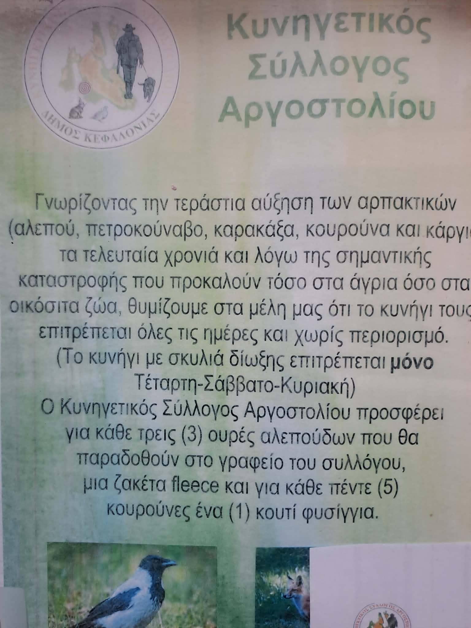 Η ανακοίνωση καταλαμβάνει περίοπτη θέση στον πίνακα ανακοινώσεων του Συλλόγου Κυνηγών στην πόλη μας. Το περιεχόμενο όσο κι αν καλύπτεται από τη νομιμότητα δεν μπορεί να κρύψει την υποβάθμιση της αξίας της άγριας ζωής καθώς και εργαλειοποίηση αυτής σαν μέσον ανταμοιβής.
