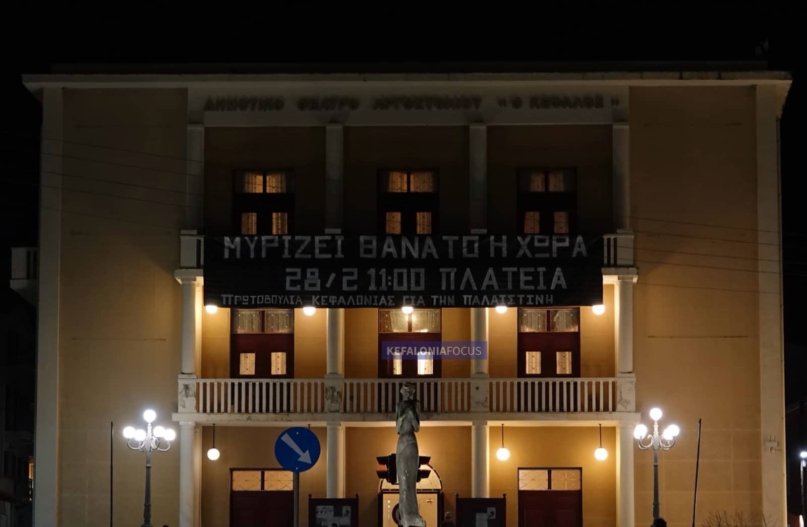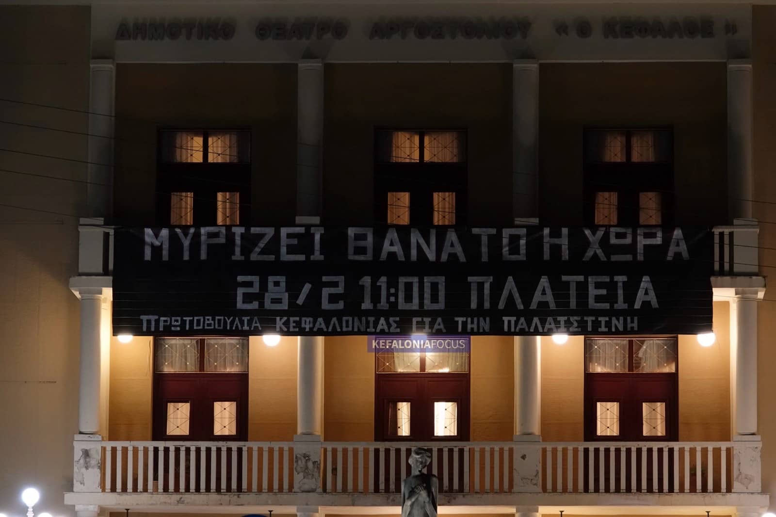 Μέλη της Πρωτοβουλίας Κατοίκων Κεφαλονιάς για την Παλαιστίνη προχώρησαν σήμερα σε μια συμβολική αλλά ιδιαίτερα ηχηρή παρέμβαση στο Αργοστόλι. Στην πρόσοψη του δημοτικού θεάτρου «Ο Κέφαλος» ανάρτησαν ένα μεγάλο πανό, με αφορμή τη συμπλήρωση τριών χρόνων από την τραγωδία στα Τέμπη.