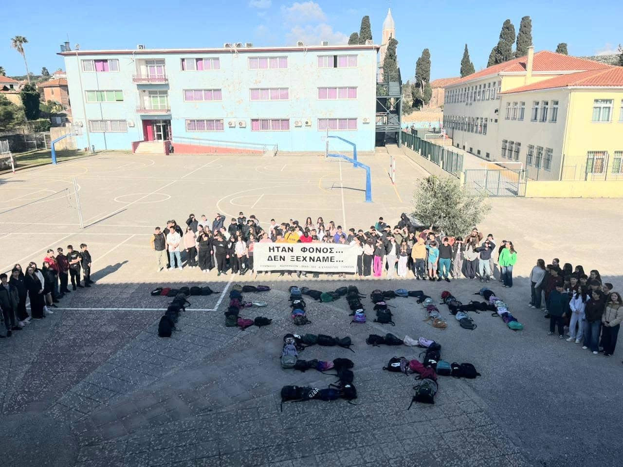 Δίπλα τους, ο Σύλλογος Γονέων και Κηδεμόνων του Βαλλιανείου Γυμνασίου Κεραμειών ύψωσε πανό, στηρίζοντας την πρωτοβουλία των μαθητών και υπενθυμίζοντας ότι η κοινωνία ολόκληρη συνεχίζει να ζητά απαντήσεις, ευθύνη και αλήθεια.
