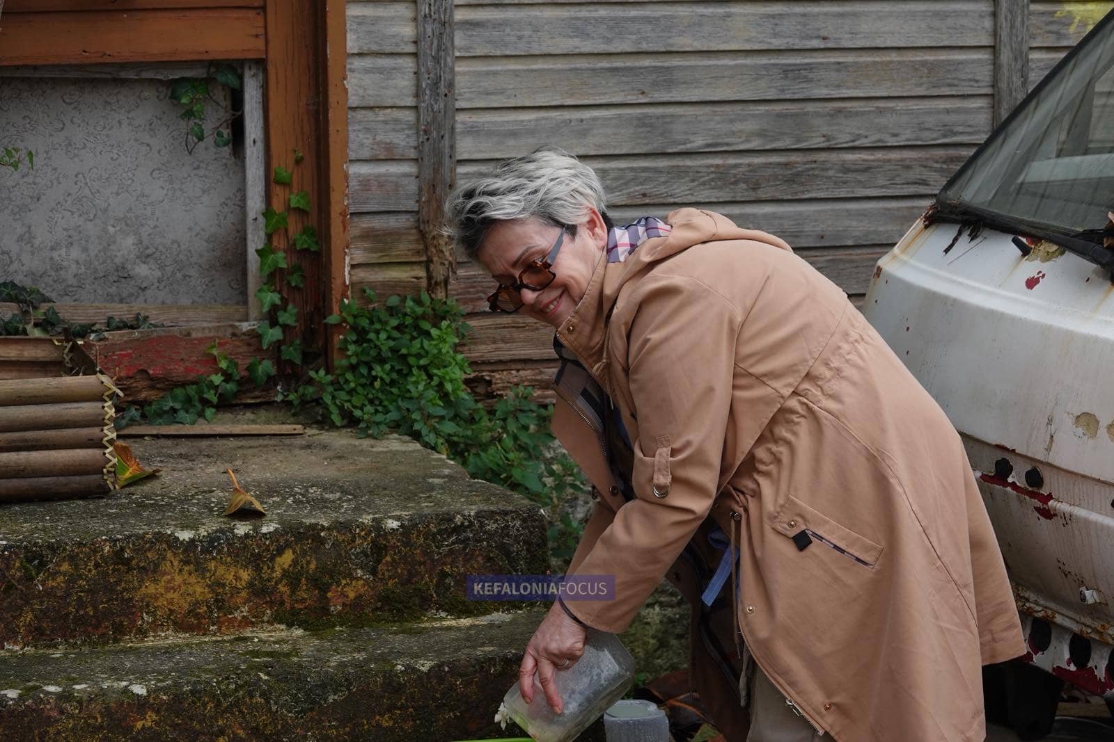 Της ζητήσαμε ευγενικά να την φωτογραφίσουμε και δέχθηκε με εκείνο το ήρεμο, αληθινό χαμόγελο που τη χαρακτηρίζει. Στάθηκε δίπλα στις γάτες που την ακολουθούν κάθε μέρα, σαν να ήταν δικές της. «Αγαπάω τα ζώα και μου αρέσει να τους προσφέρω αυτό που μπορώ», είπε απλά, χωρίς στόμφο, σαν να περιέγραφε κάτι αυτονόητο.