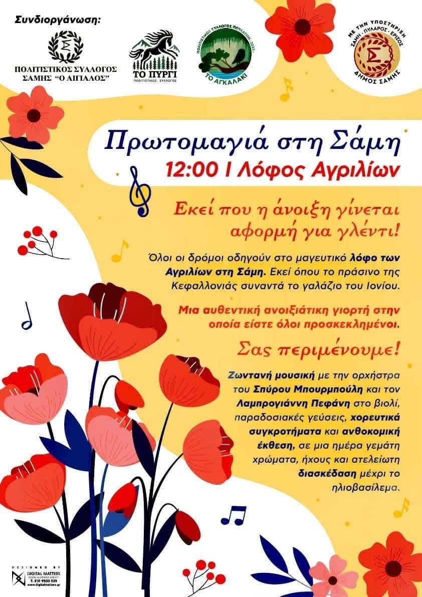 Οι Πολιτιστικοί Σύλλογοι Σάμης, «Ο Αιγιαλός», «Το Πυργί» και «Το Αγκαλάκι», σας προσκαλούν στον Λόφο του Μοναστηριού των Αγριλίων για να γιορτάσουμε όλοι μαζί την Πρωτομαγιά 🌺