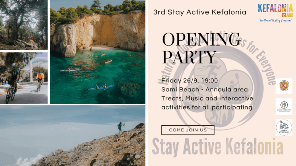 Οι Δήμοι της Κεφαλονιάς υποδέχονται, για τρίτη συνεχή χρονιά, την καθιερωμένη πλέον διοργάνωση Stay Active Kefalonia από τις 26 έως τις 28 Σεπτεμβρίου 2025, προσκαλώντας όλη την οικογένεια να γνωρίσει την Κεφαλονιά μέσα από μια τεράστια γκάμα υπαίθριων δραστηριοτήτων και εκδηλώσεων.